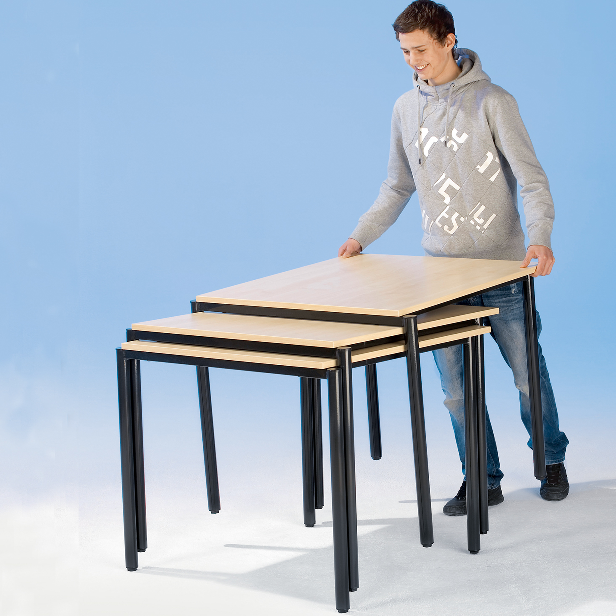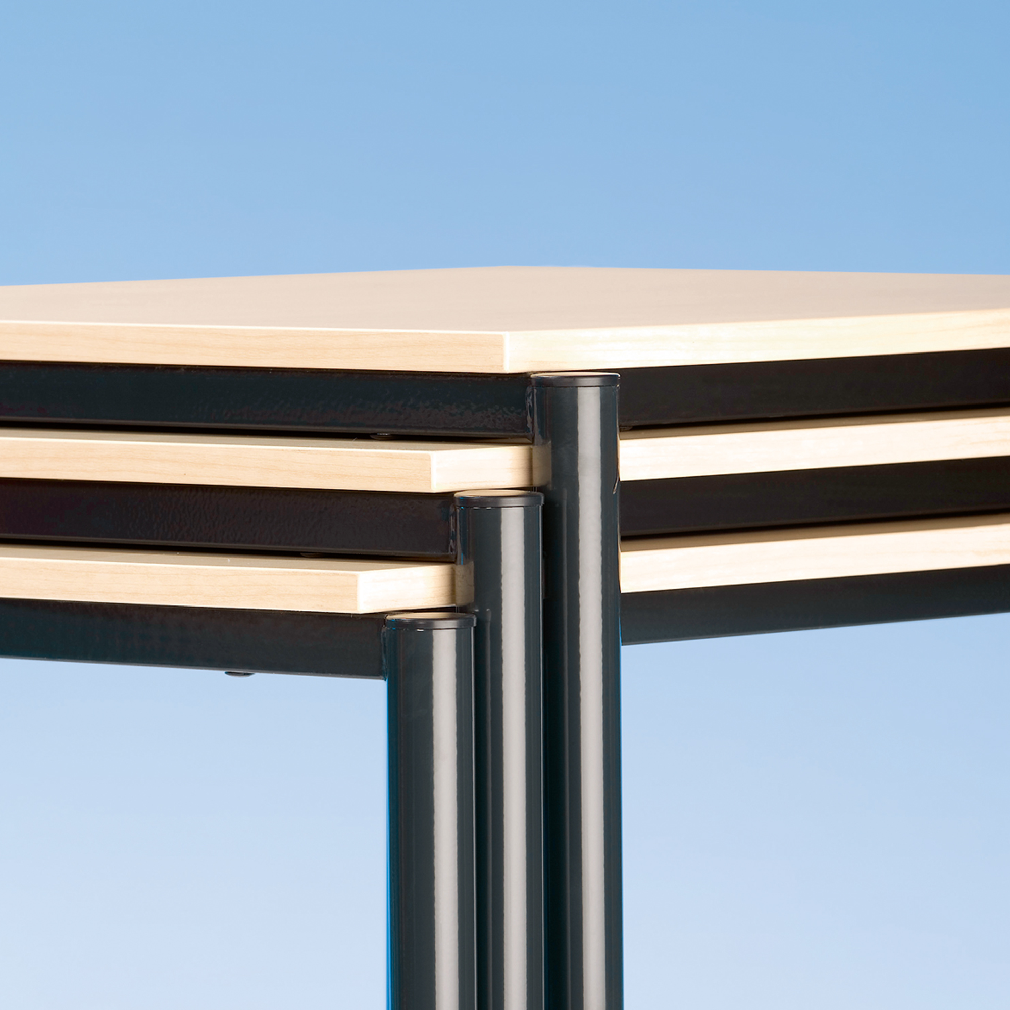 Tischbeine aus einem 40 mm Stahlrundrohr und eine fest verschweißte Zarge nehmen die Tischplatte stabil auf. Unterhalb der Zarge ist ein Stapelschutz angebracht, der beim Aufstapeln der Tische die untere Tischplatte schont.