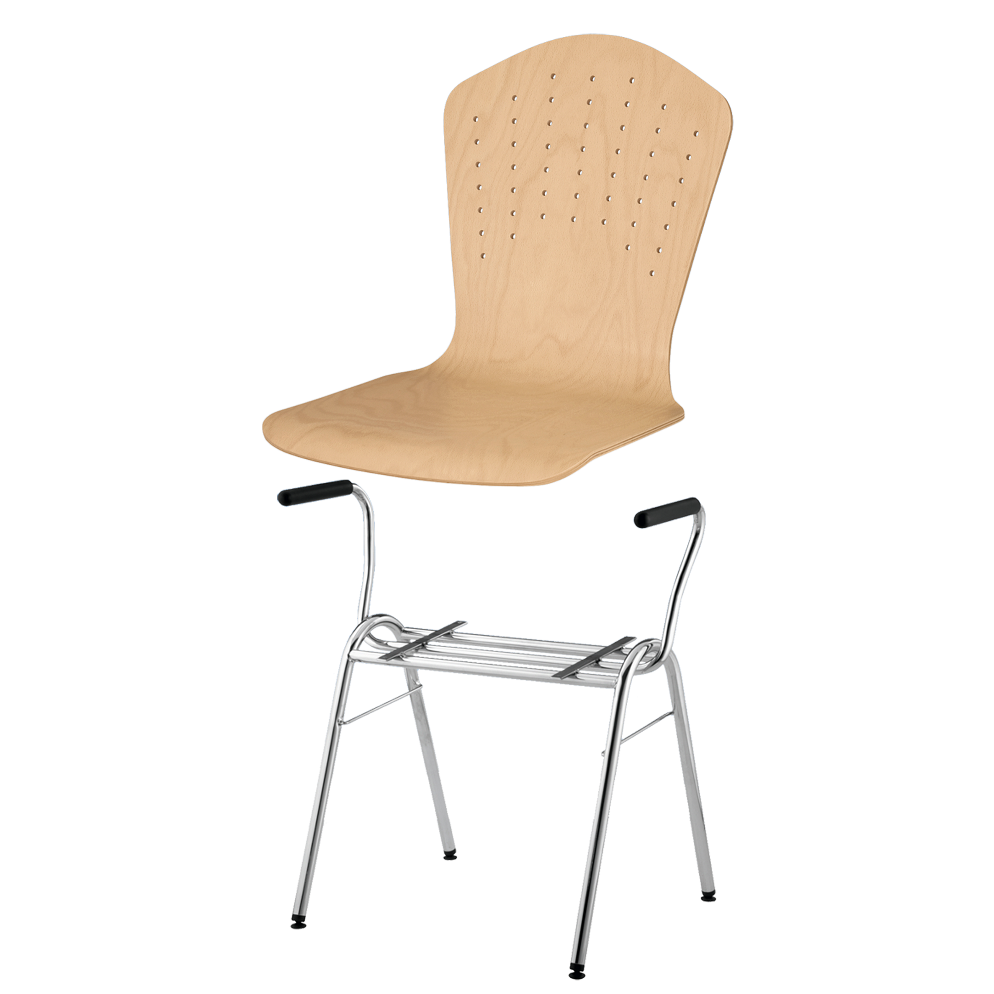 Der stapelbare Schalenstuhl mit Sitzschale "London" kann mit Rundrohrgestellen in unterschiedlichen Bauformen, mit und ohne Armlehnen und / oder Reihenverbindung bestellt werden. Die Sitzschale besteht aus mehrfach verleimtem formgepreßtem Bucheschichtholz und ist ergonomisch gearbeitet, natur lackiert.