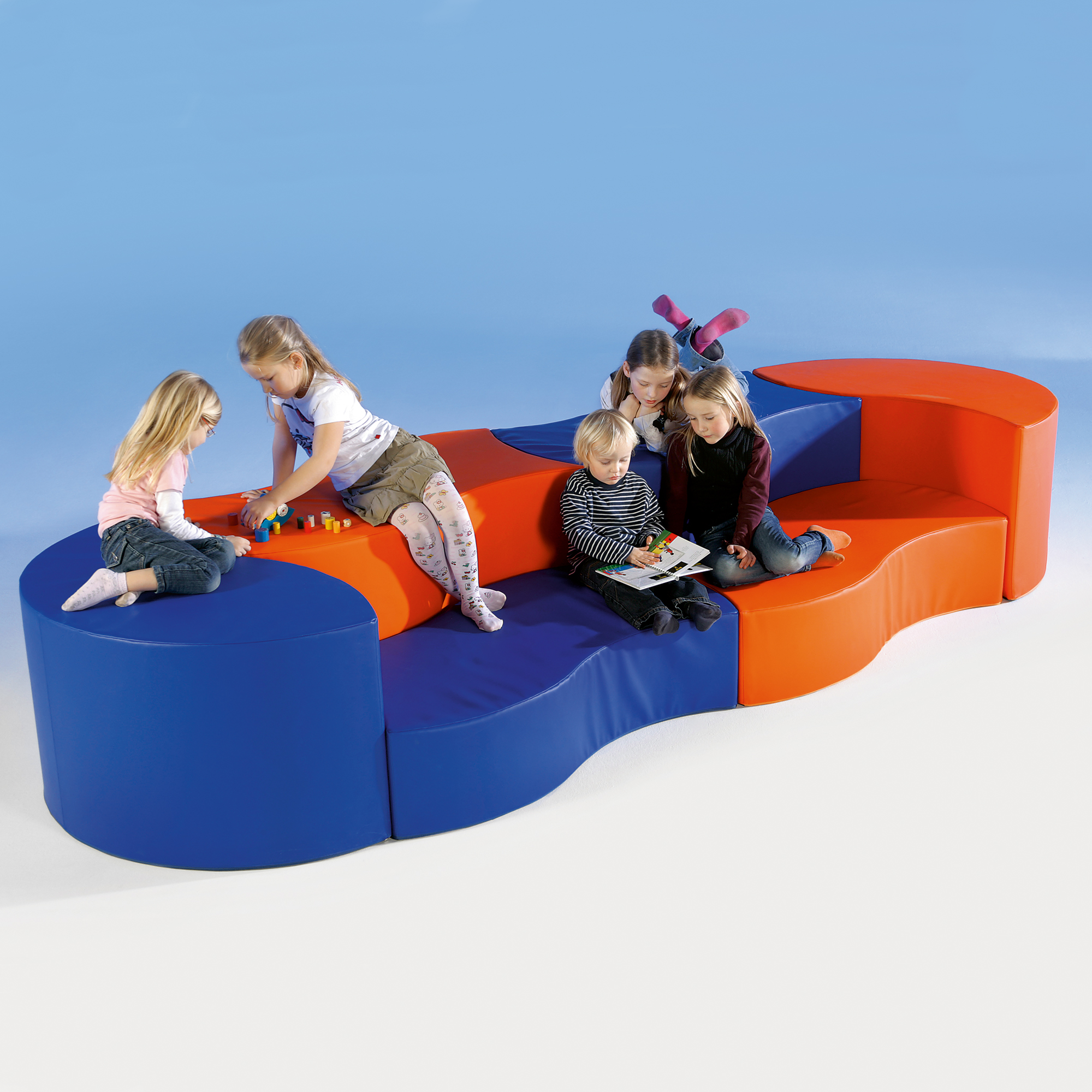 Ein riesiges Sofa mit Platz für viele Kinder auf beiden Ebenen. Die Unterseite der Swing-it Sit Sitzgruppe ist aus Anti-Rutsch-Gewebe und sorgt für die nötige Standfestigkeit.
