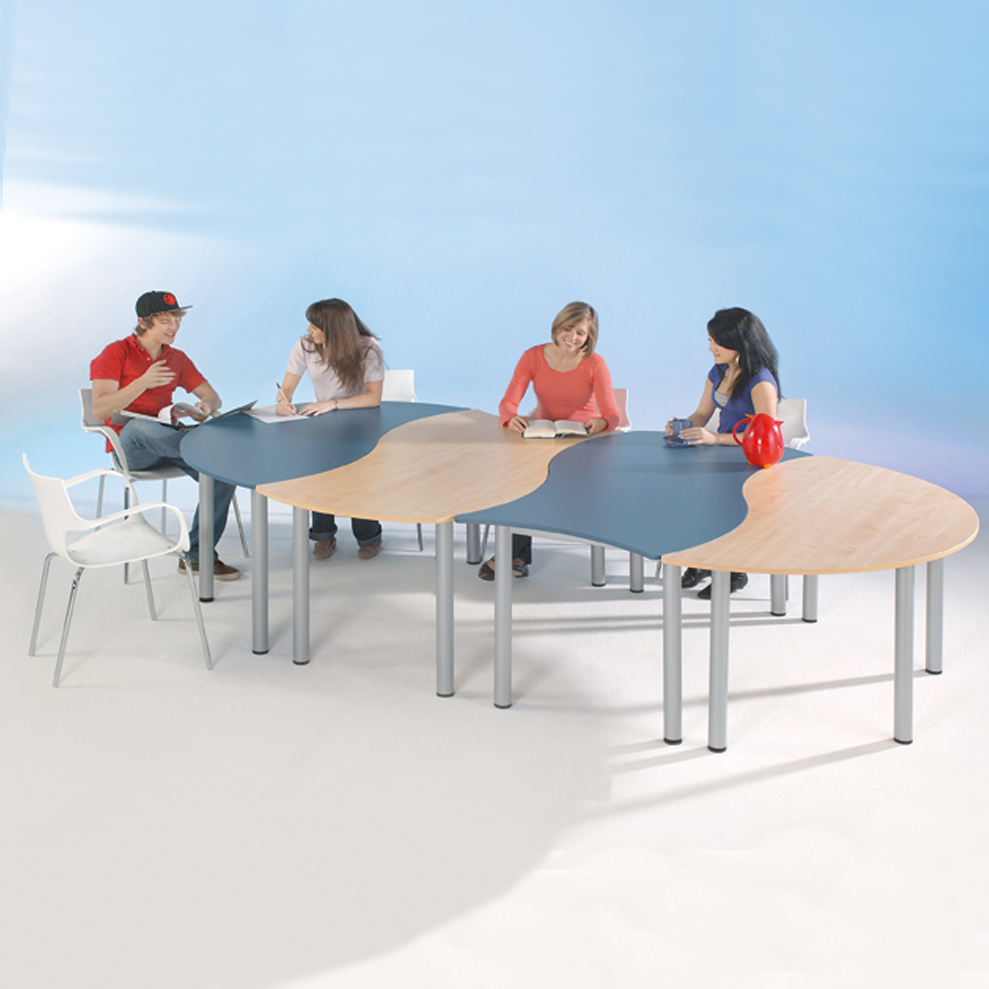 Die Tische der Serie "SoooRounD" zeichnen sich durch eine Kombinationsvielfalt beim zusammenstellen aus. Konkave und konvexe Seiten passen zusammen wie Puzzleteile. Die Tische können aber auch beliebig zusammengestellt werden und sind so individuell einsetzbar.