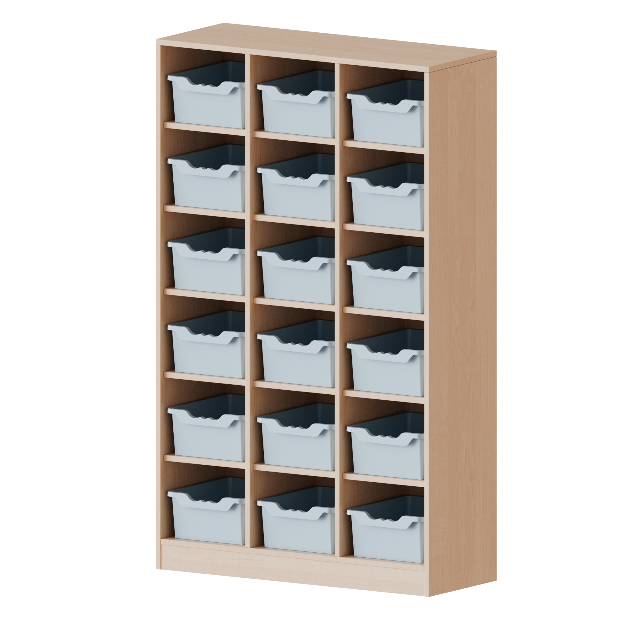 Breite 104,5 cm, Gesamthöhe 172 cm, 18 halbhohe Fächer, je Fach mit einer hohen ErgoTray Box, mit Sockel (81 mm)