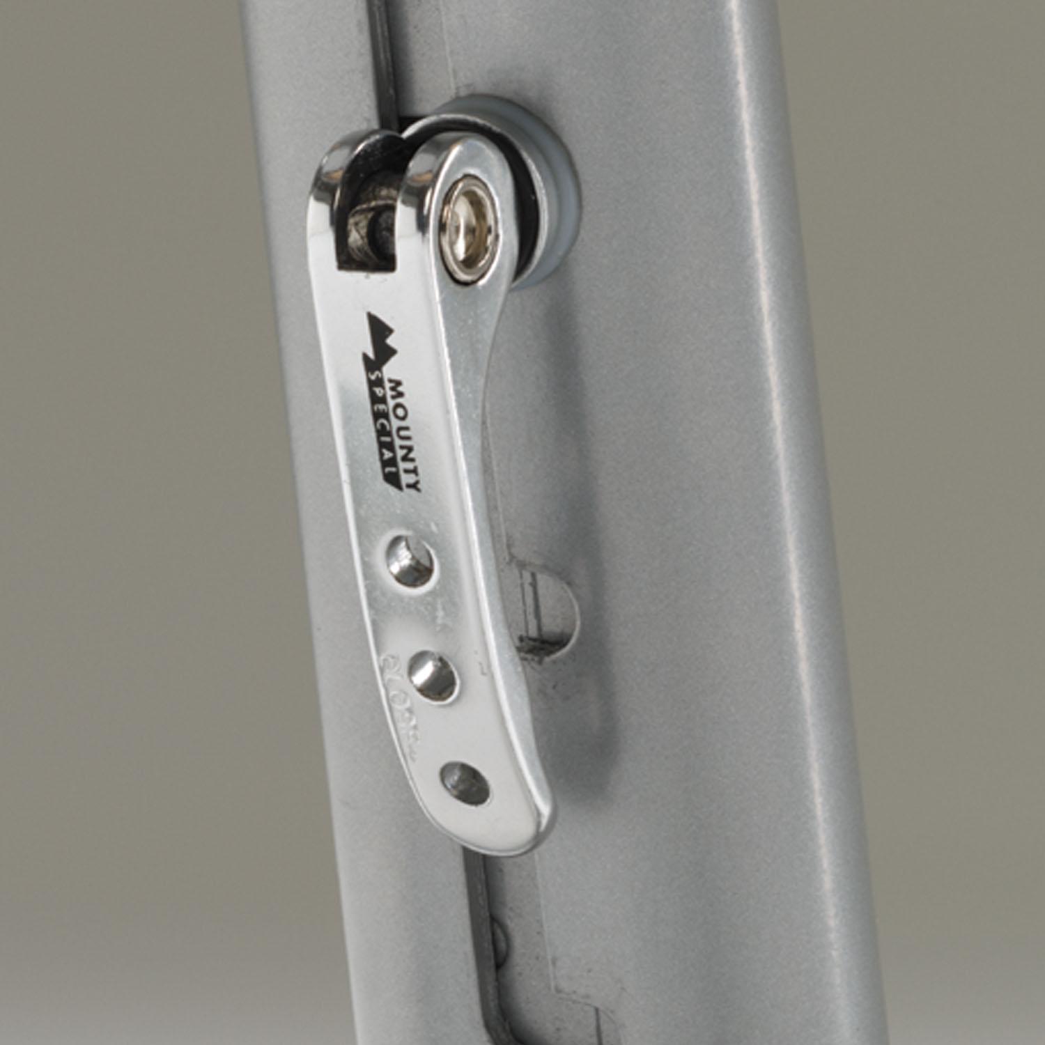Zusätzlich verfügt der Tisch über eine Stuhl-Einhängevorrichtung unter der Tischplatte, in die der Stuhl einfach eingehängt werden kann.