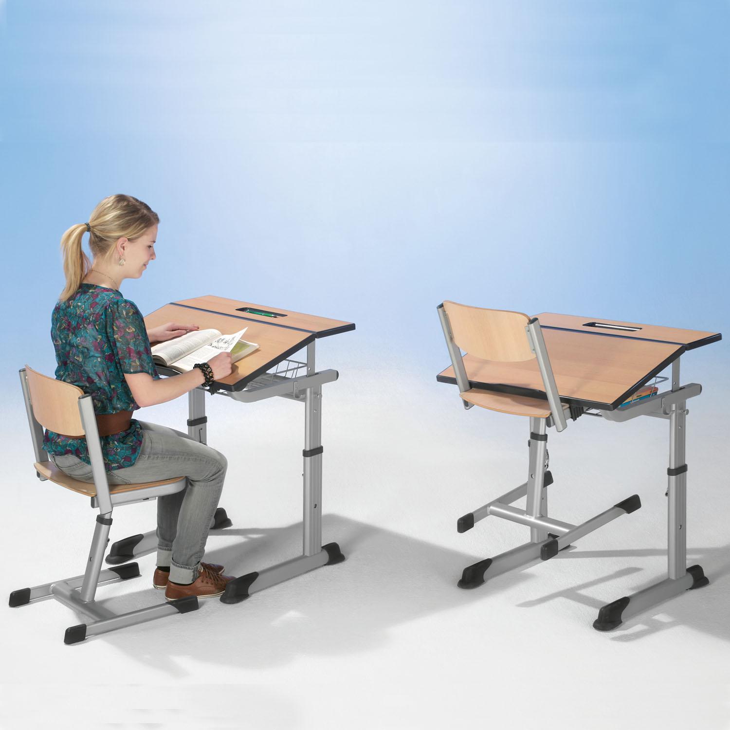 Einer- oder Zweierschülertisch mit 3-stufiger Höhenverstellung in DIN-Höhen. Tischplatte ist 2/3 neigbar mit Drahtkorbablage.