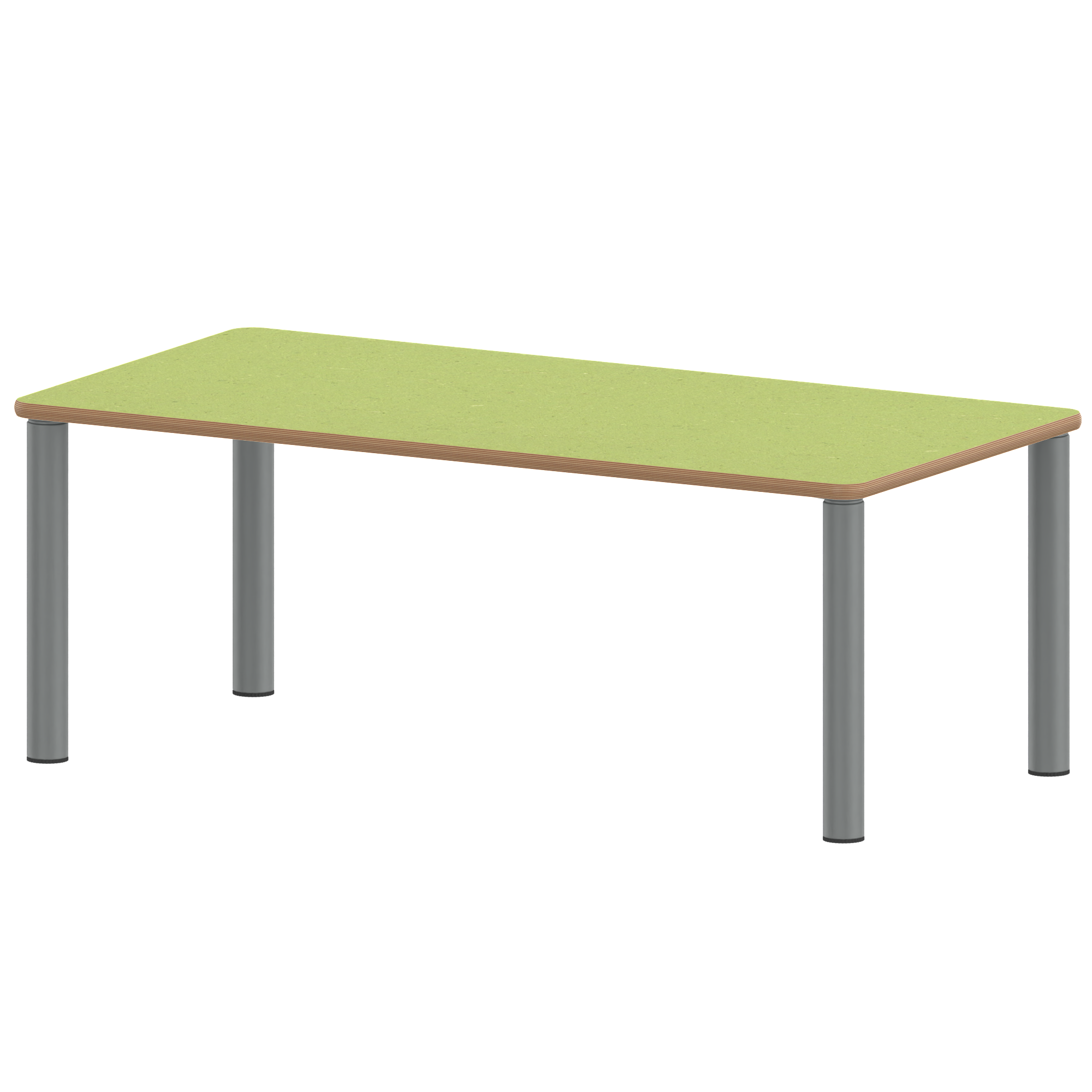 Die Ecken der Tischplatte sind großzügig abgerundet, die umlaufende Tischkante ist ballig gefräst und wasserabweisend beschichtet.