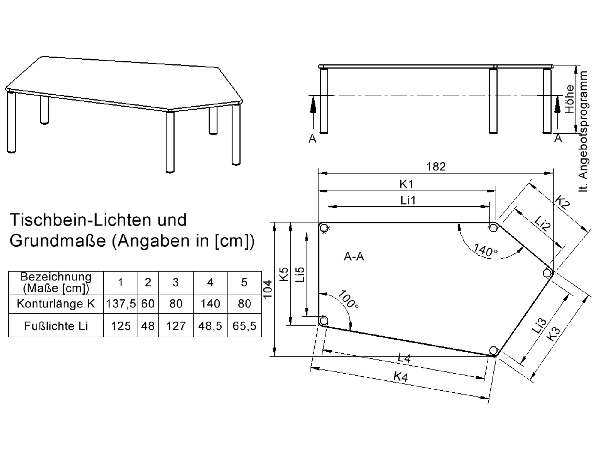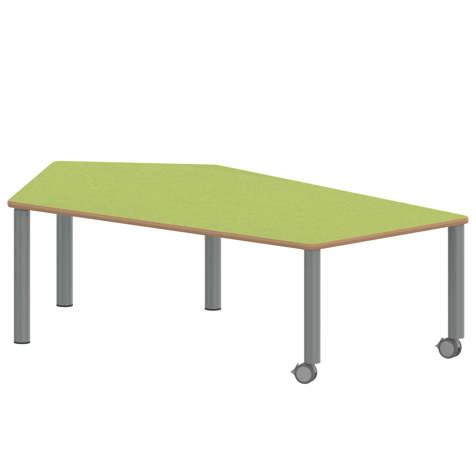 Fünfecktisch-groß, Stellfläche B/T: 185x104 cm, Höhen 25…76 cm, Stahlrohrbeine Ø 60 mm, Fußvariante: fahrbar