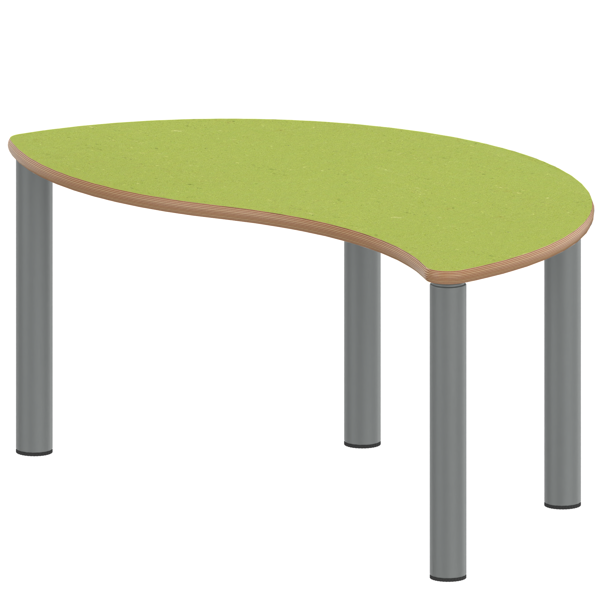 Die Ecken der Tischplatte sind großzügig abgerundet, die umlaufende Tischkante ist ballig gefräst und wasserabweisend beschichtet.