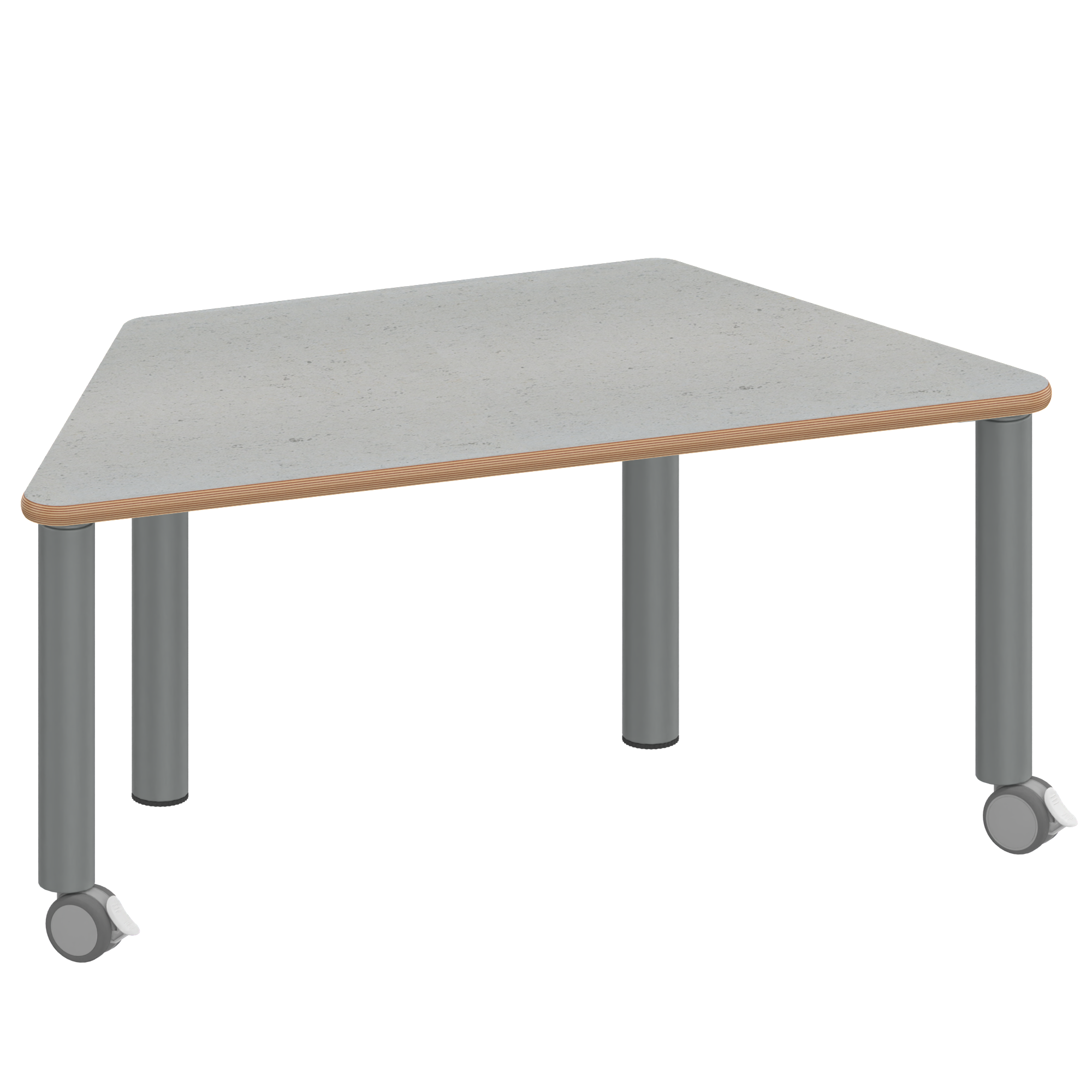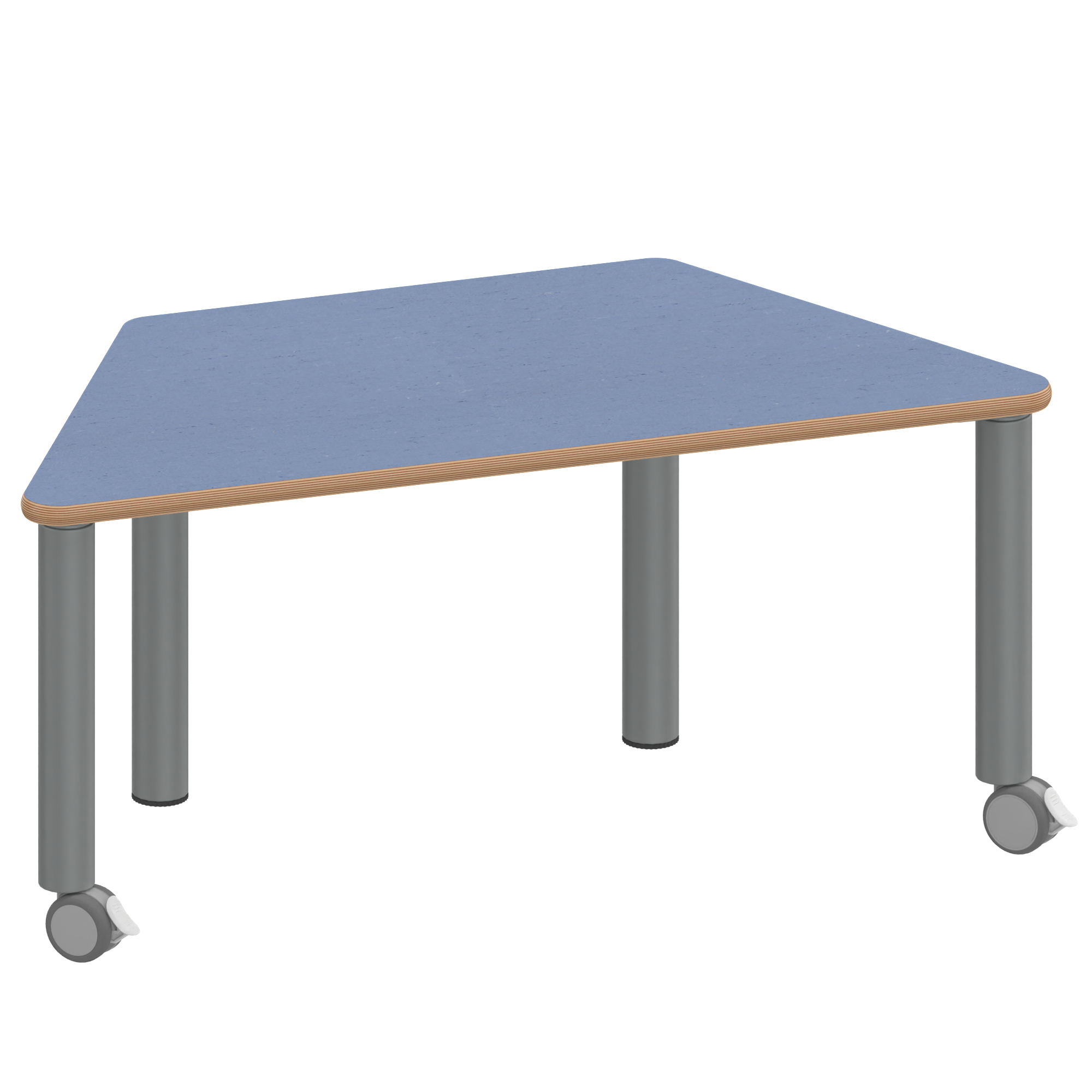 Trapez-Tische, Maße B/T: 140x70 bzw. 120x60 cm, Höhen 25…76 cm, Stahlrohrbeine Ø 60 mm, Fußvariante: fahrbar
