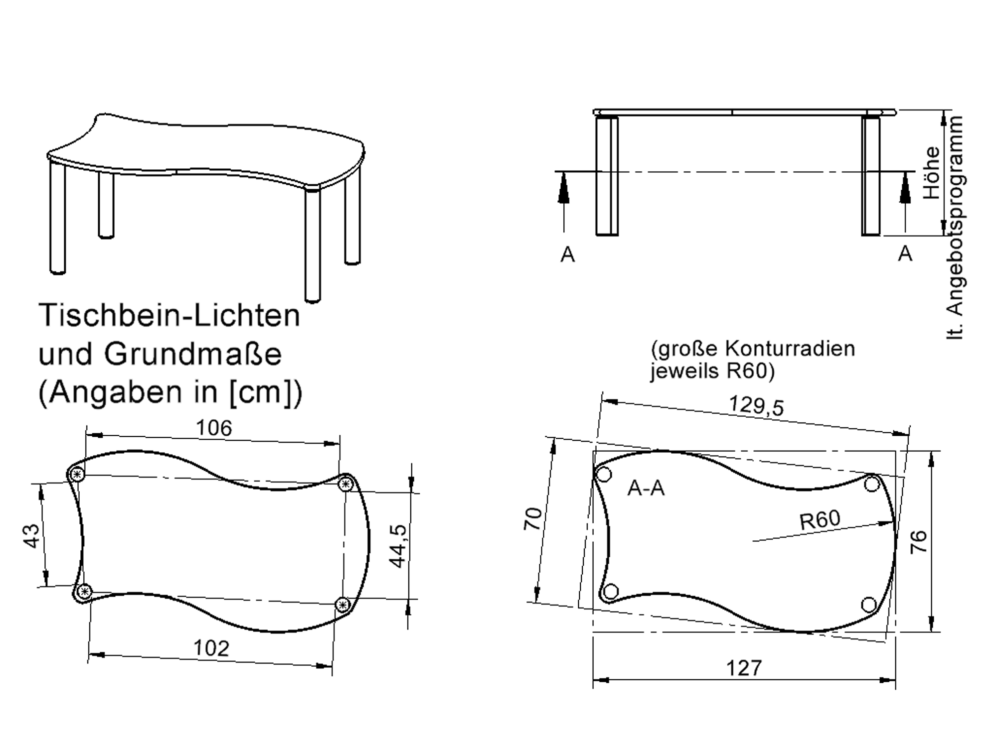 Rechteck-Wellentische, Stellfläche B/T: 126,7x76 cm, Höhen 25…76 cm, Massivholzbeine Ø 60 mm, Fußvariante: Stellfuß