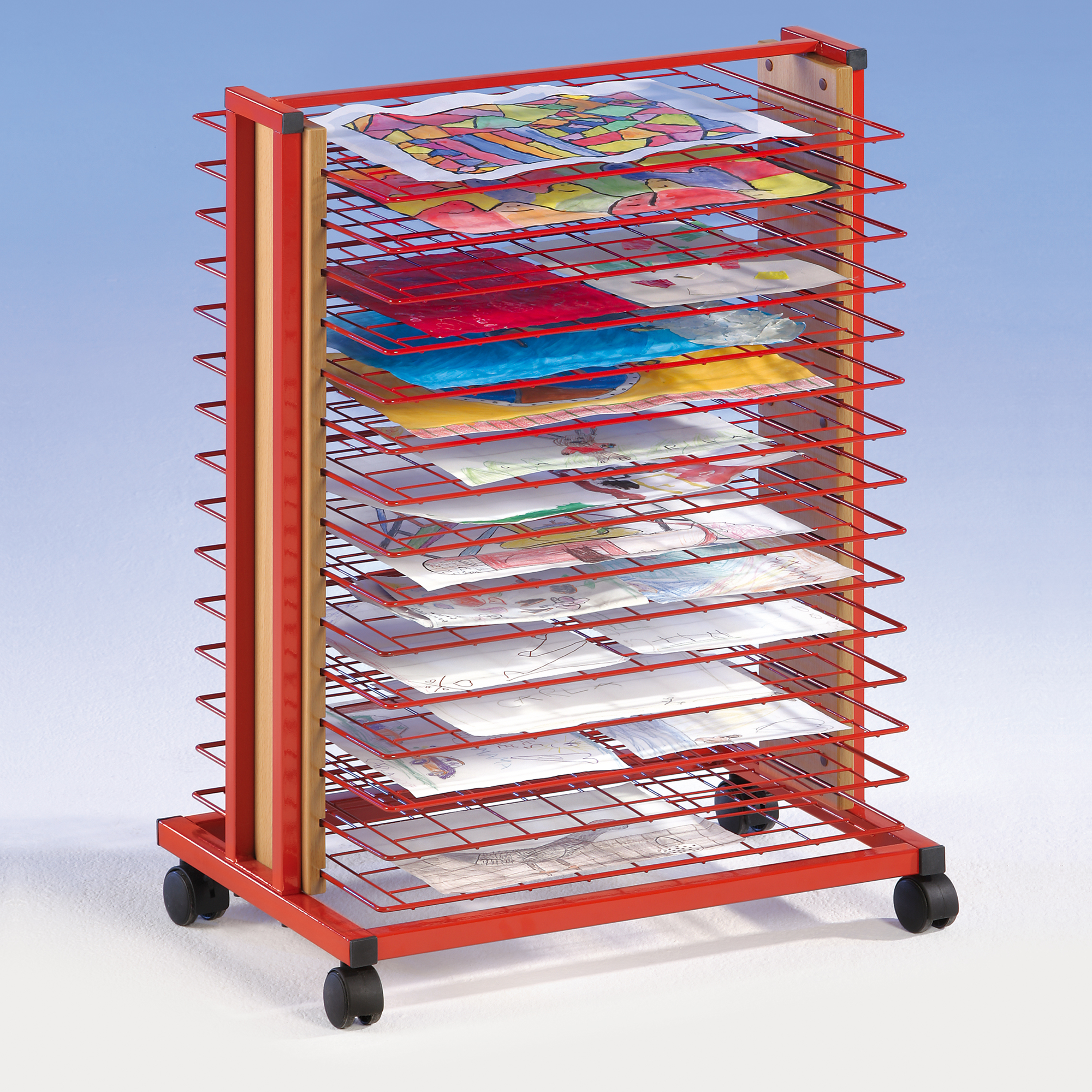 Unser Trockenwagen ist der perfekte Helfer in Ihrem Kunstraum. Jedes Kind kann sein Bild in diesem praktischen Trockenwagen aufbewahren und trocknen lassen. Er ist aus pulverbeschichtetem Stahl gefertigt und ist somit kratz und schlagfest.