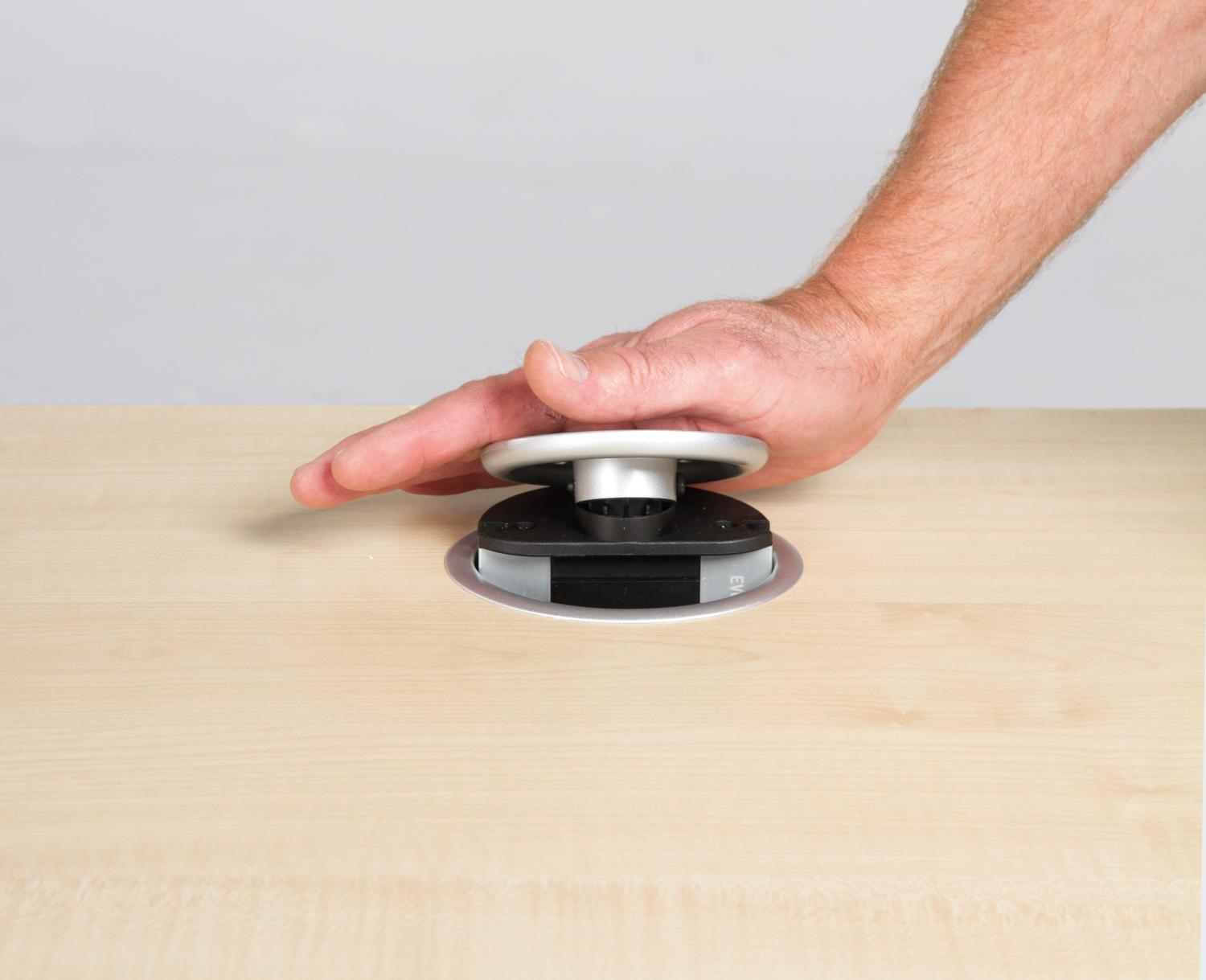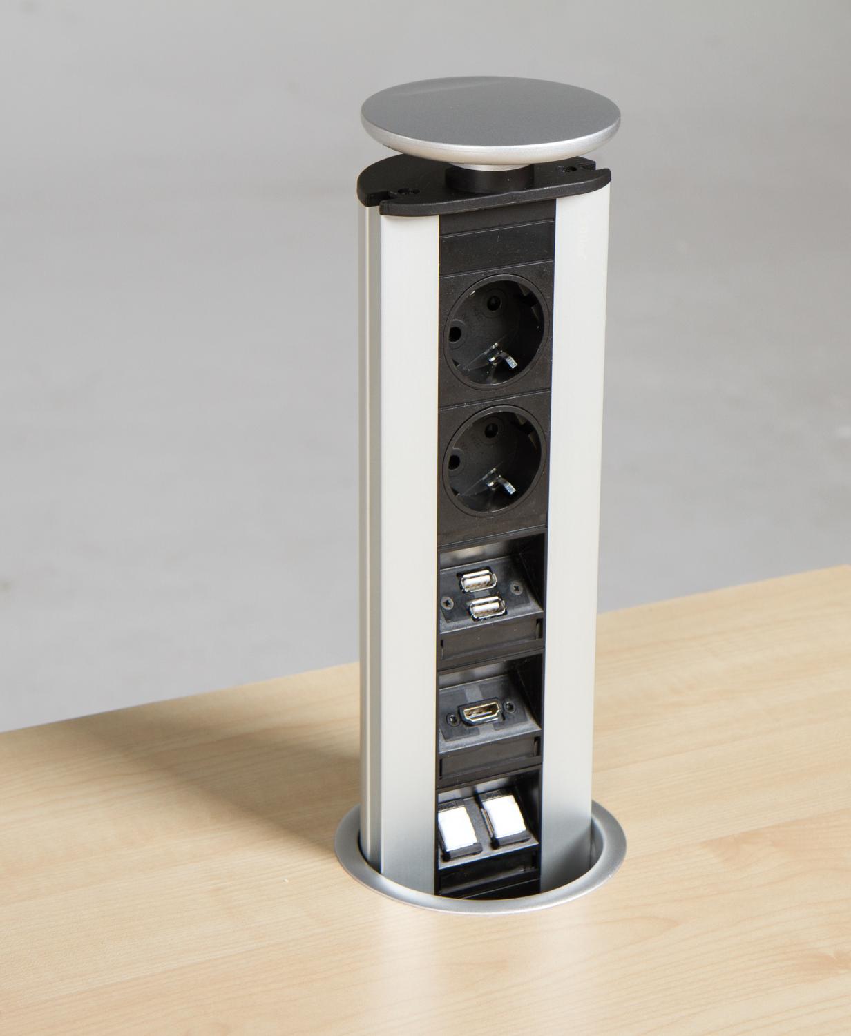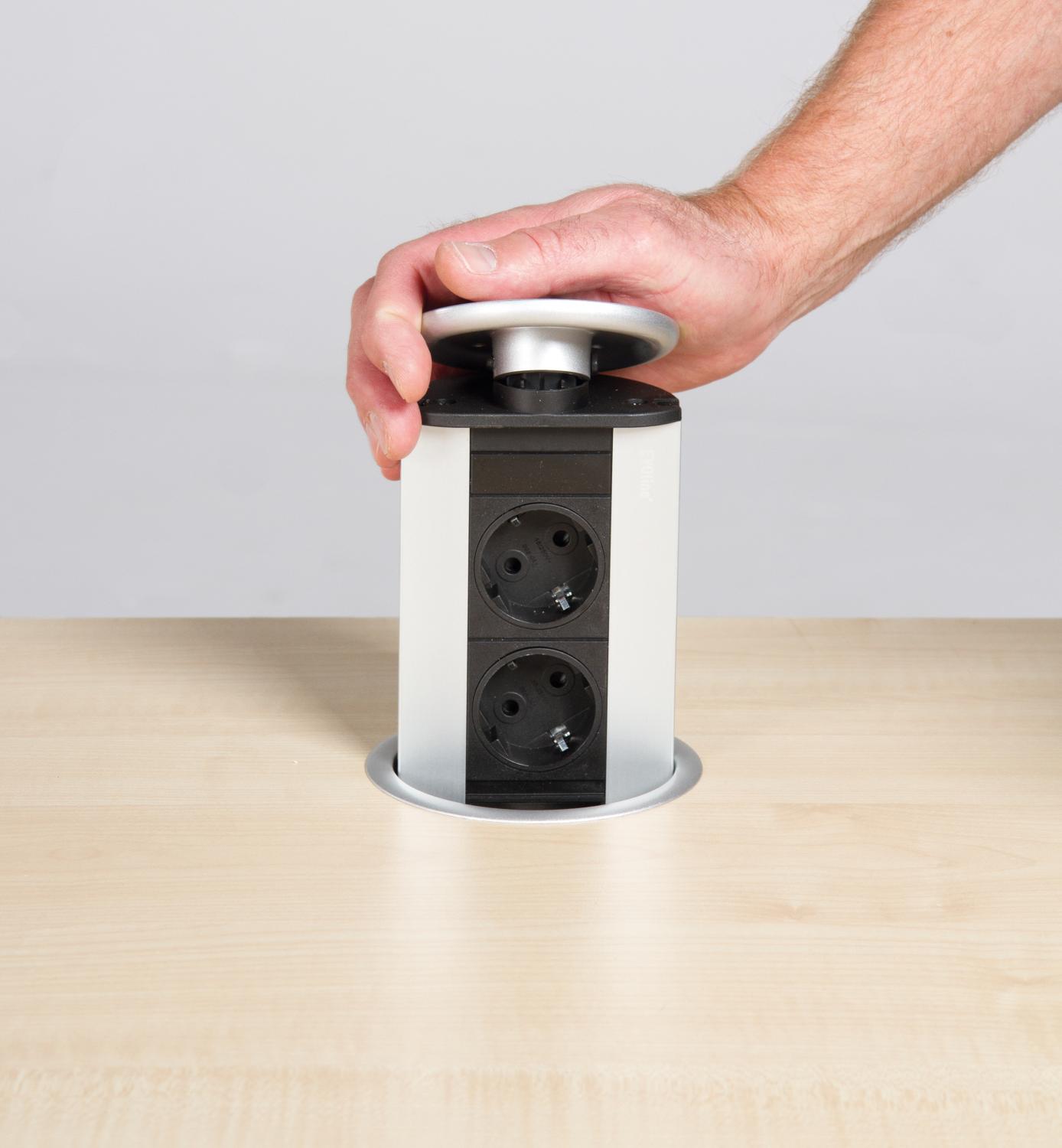 Versenkbare Tischeinheit mit praktischen Anschlüssen für viele Geräte. Mit dieser versenkbaren Multifunktionseinheit vermeiden Sie unnötiges Kabel-Chaos auf Ihrem Schreibtisch. Die komplette Einheit kann bei Bedarf leichtgängig in den Tisch eingelassen oder herausgezogen werden. Dank der modernen Abdeckplatte kann die Einheit komplett im Tisch versenkt werden - so steht die Steckerleiste nicht im Weg.