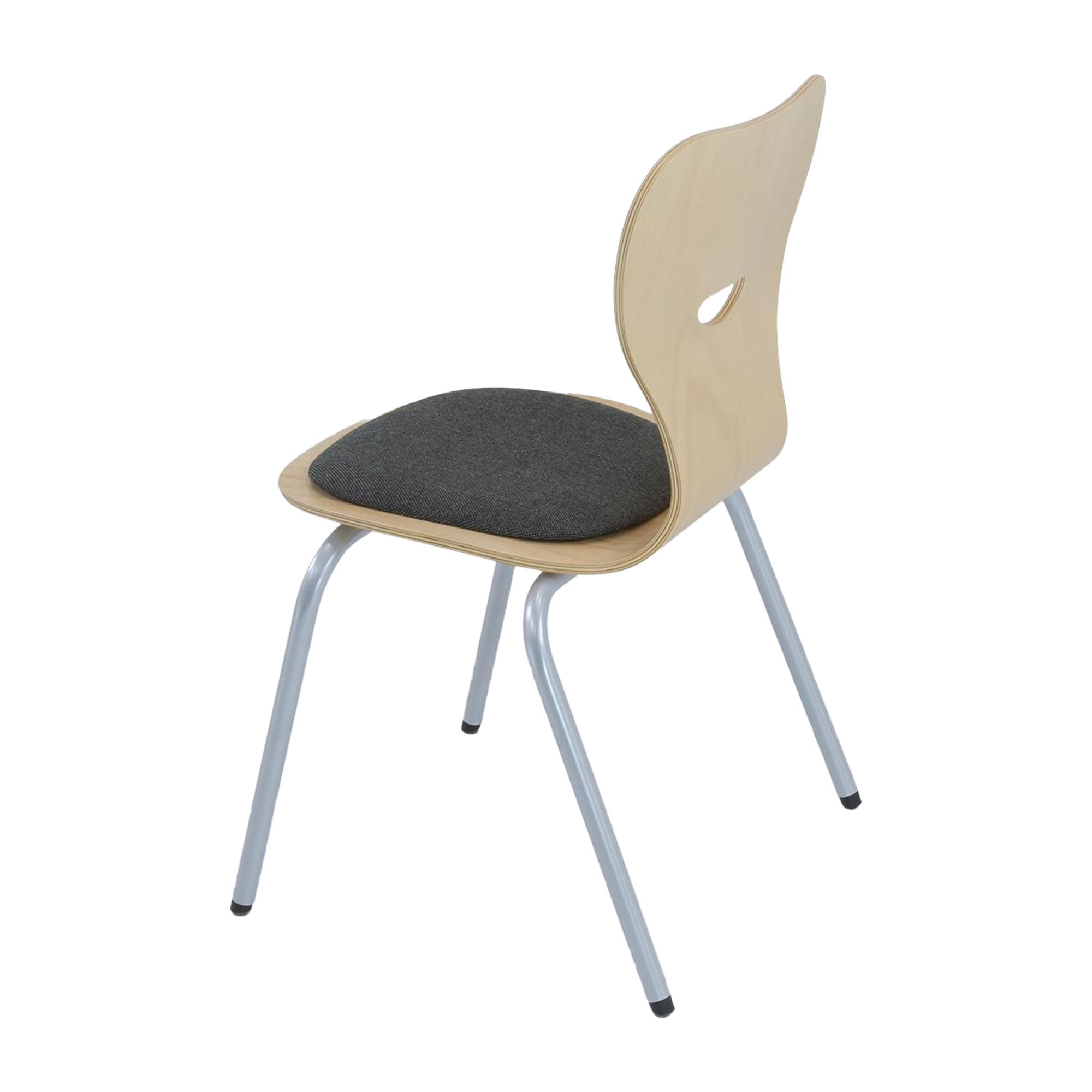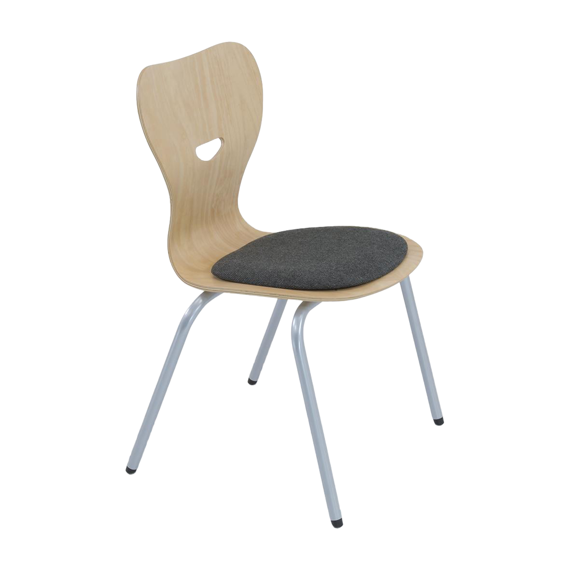 Unser stapelbarer Vierbeinstuhl zeichnet sich durch seine ergonomisch geformte Sitzschale Typ S, aus Buchensperrholz naturlackiert, mit Griffloch, aus.