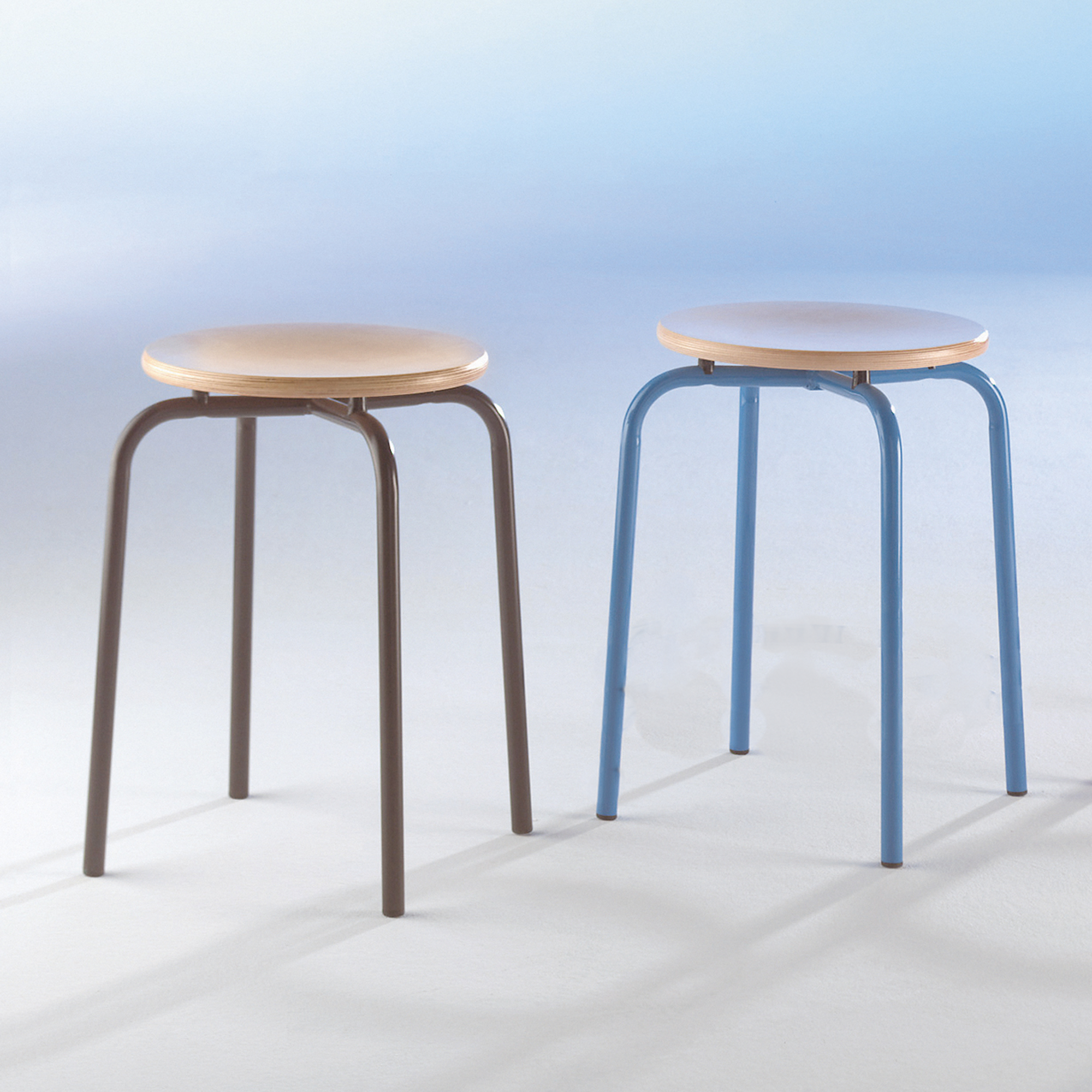 Unser 4-Bein-Hocker ohne Fußstütze. Das Rundrohrgestell hat 22x2 mm, alle Stahlteile sind Kunststoffpulverbeschichtet und unten mit Kunststoffgleitern versehen. Die Sitzfläche besteht aus Mehrschicht-Buchensperrholz mit Melaminharzbeschichtung. Der Hocker ist stapelbar, das Dekor ist Buche natur.
