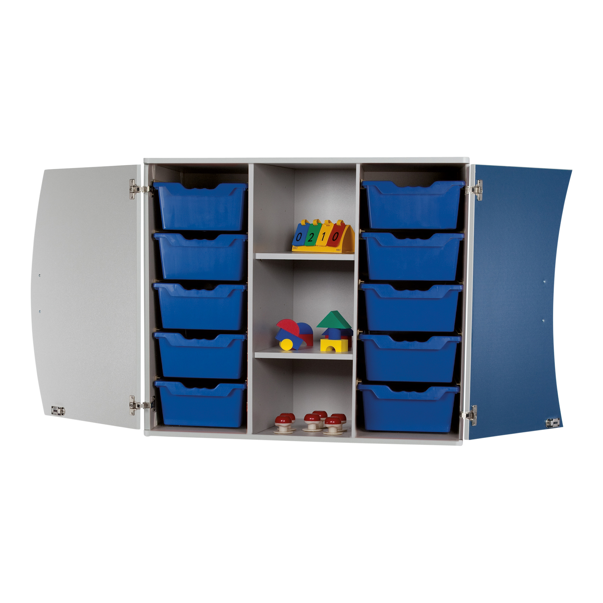 Der besondere Klassenraumschrank mit dem gewissen Etwas: Die Türen mit der Welle. Sie sorgen für eine einzigartige Optik im Klassenraum und schaffen eine kreative und moderne Raumgestaltung. Die abschließbaren Türen öffnen sich um 270°, wodurch sie niemals im Weg sind und eine optimale Nutzung des Schrankraums ermöglichen. Im Inneren des Schranks befinden sich A4 Ergo Tray Boxen, die aus extra starkem, schwer entflammbarem, bruchsicherem und recycelbarem Kunststoff gefertigt sind. Diese Boxen bieten reichlich Stauraum und sorgen für eine ordentliche und sichere Aufbewahrung. Der Schrank verfügt zudem über zwei verstellbare Einlegeböden, die individuell anpassbar sind, um unterschiedlichen Bedürfnissen gerecht zu werden.