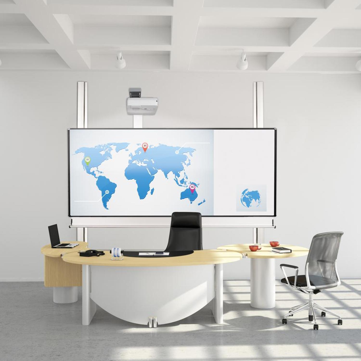 Die Projektionsfläche ist matt weiß, mit Whiteboardmarkern beschreibbar und trocken abwischbar. Sie ist zur Nutzung mit Ultrakurzdistanzprojektoren geeignet. Zusätzlich dazu ist die Mittelfläche des Whiteboards magnethaftend. Der schwarz eloxierte Rahmen sorgt für einen guten Kontrast und besitzt Sicherheits-Eckkappen. Dank der Tafelbreite von 3,00 Metern bleibt genug Platz für Anmerkungen, Poster und Notizen. Die Anordnung der Projektion ist rechts- oder linksbündig möglich. Bitte geben Sie dies bei der Bestellung an.
