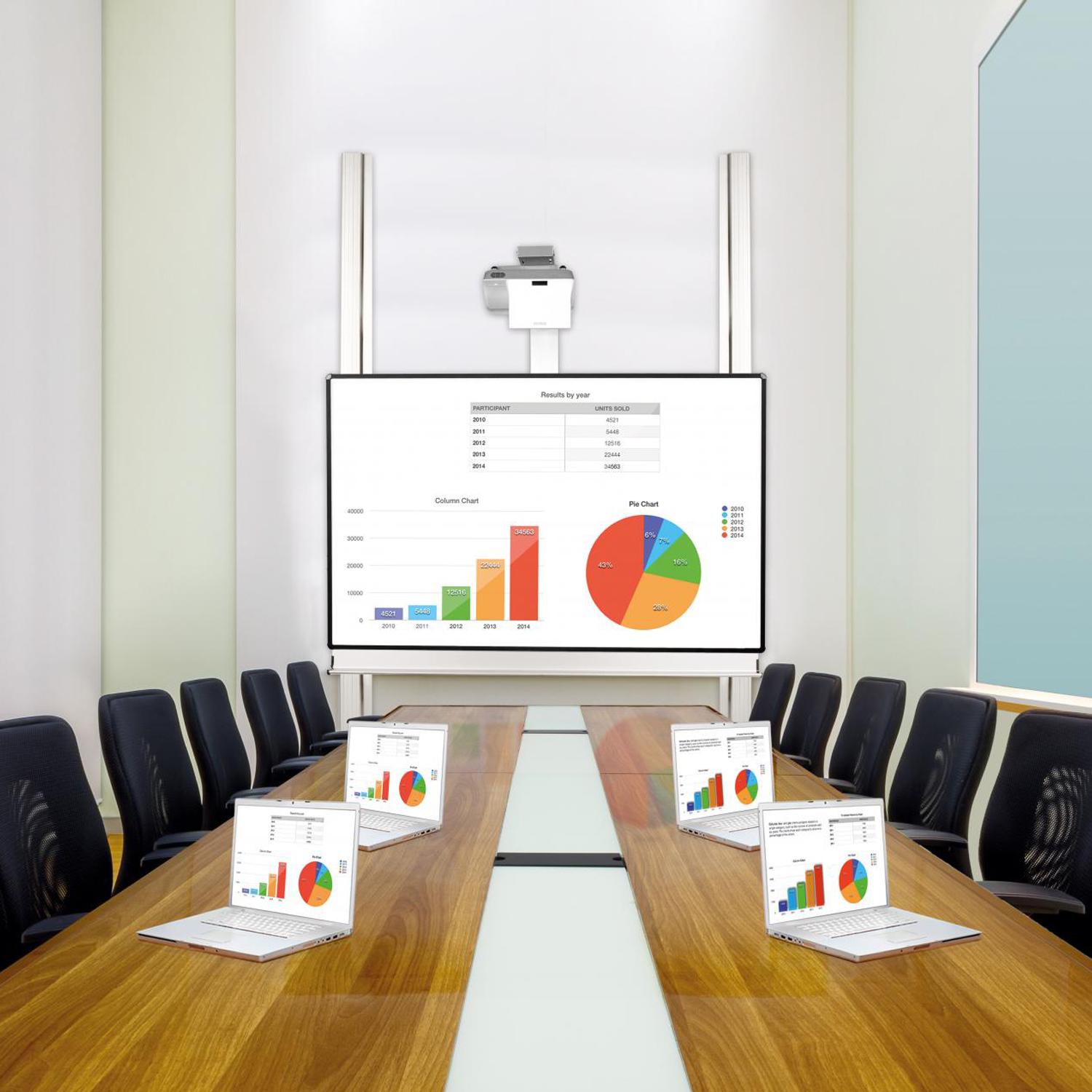 Die Projektionsfläche ist matt weiß, mit Whiteboardmarkern beschreibbar und trocken abwischbar. Sie ist zur Nutzung mit Ultrakurzdistanzprojektoren geeignet. Zusätzlich dazu ist die Mittelfläche des Whiteboards magnethaftend. Der schwarz eloxierte Rahmen sorgt für einen guten Kontrast und besitzt Sicherheits-Eckkappen.