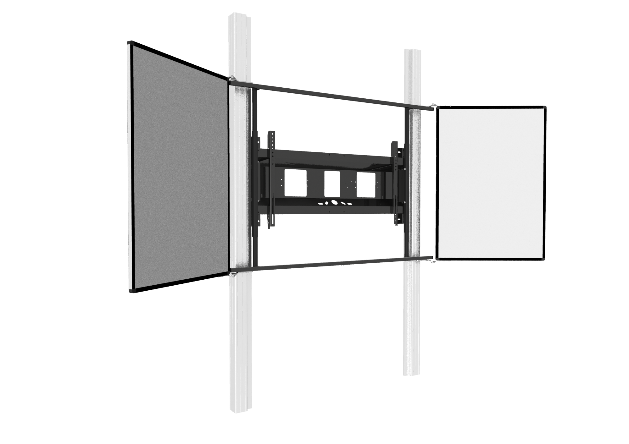 Die Seitenflügel werden inklusive Tafelscharnieren sowie Ober- und Unterstange zur stabilen Verbindung der Flügel mit dem Rahmen geliefert. Der Rahmen der Seitenflügel ist aus Aluminium (schwarz eloxiert), mit abgerundeten Kunststoff-Eckkappen.