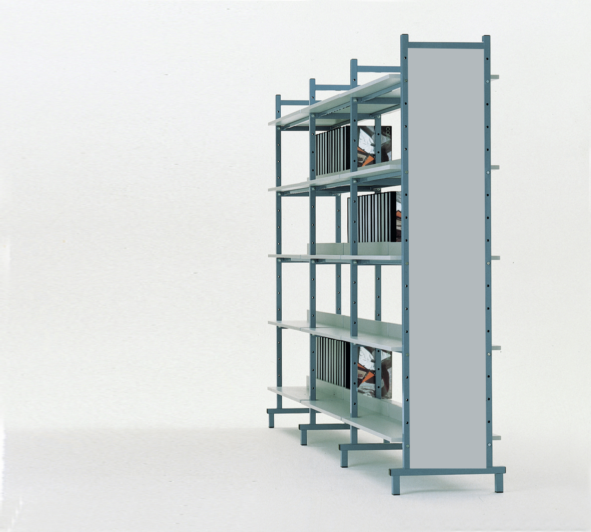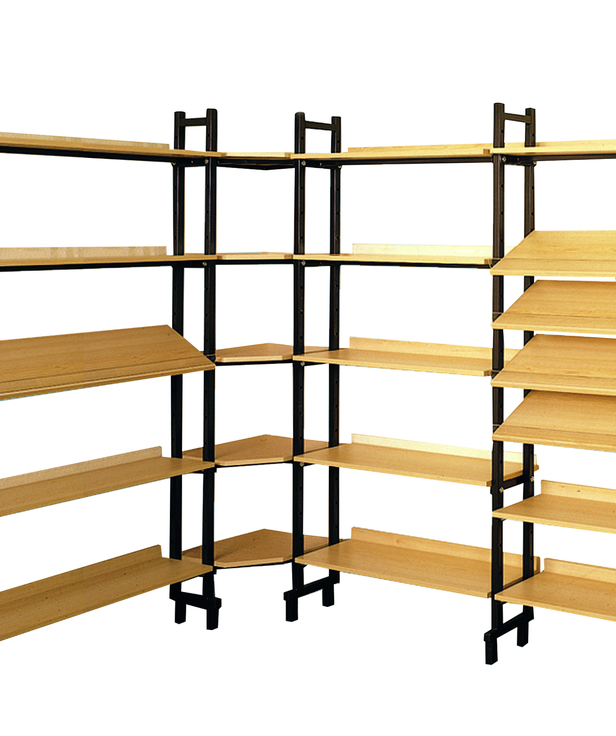 Bücherregal-Eckteil mit 5 Tragrahmen und 5 Eckböden ohne Seitenteile. Böden aus beiseitig melaminharzbeschichteten 19mm E1-Feinspanplatten, alle Kanten mit 2mm ABS Umleimer geschlossen. Belastbarkeit größer 100kg je Boden. Tragrahmen aus umlaufenden epoxidharzpulverbeschichteten...