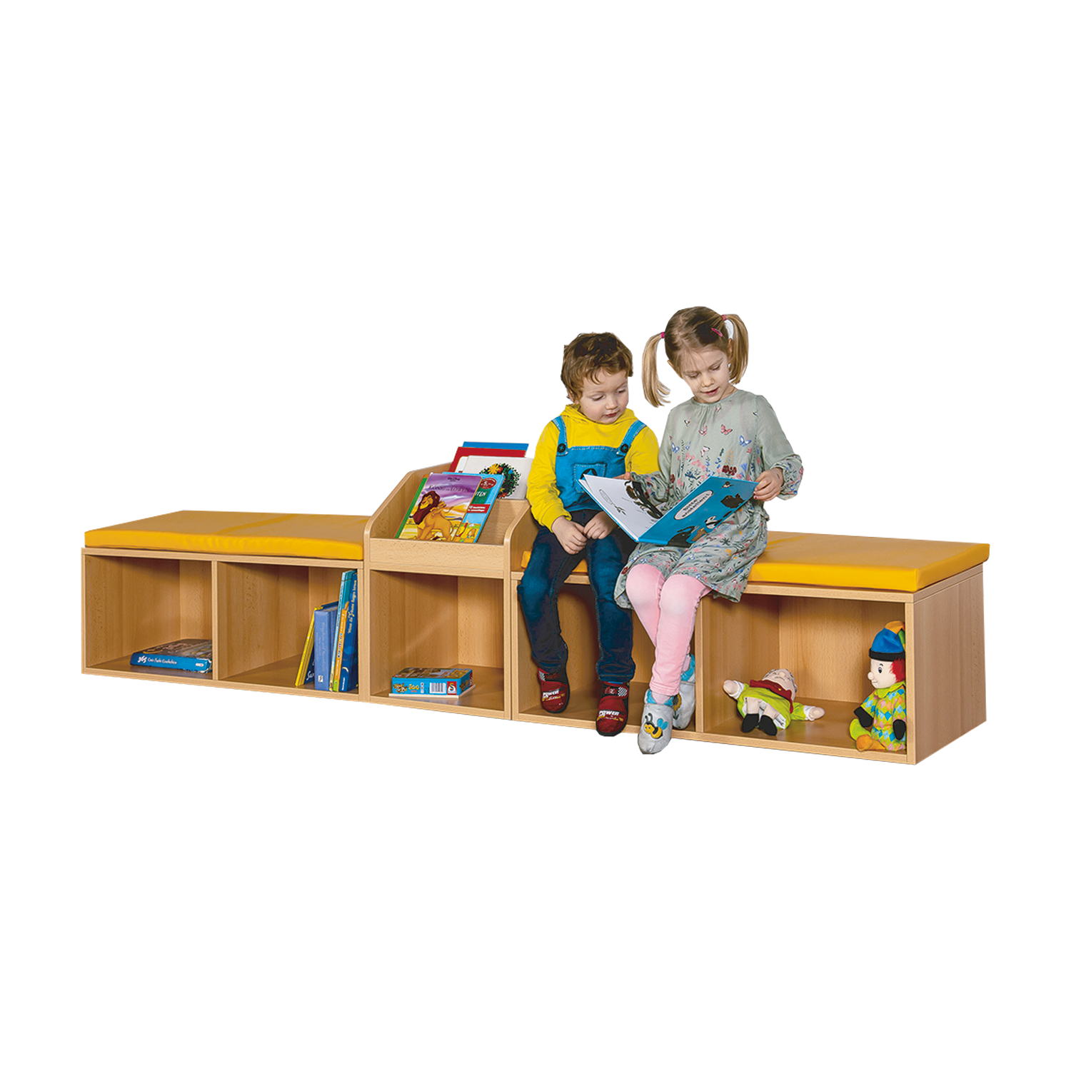 Ein Bücherkasten mittig zwischen den Sitzpolstern dient der Bücheraufbewahrung.