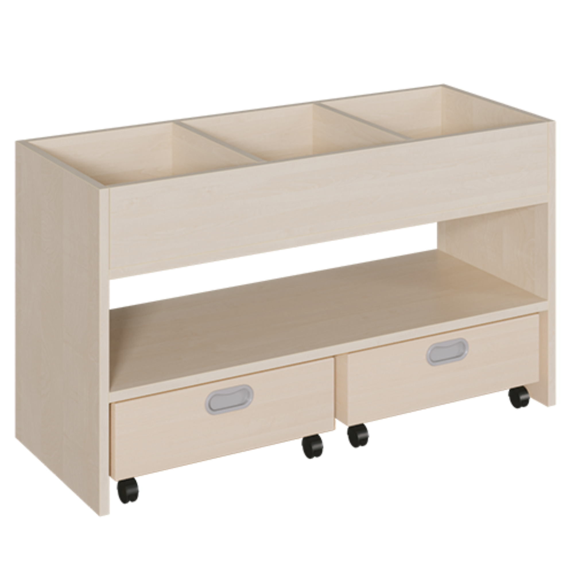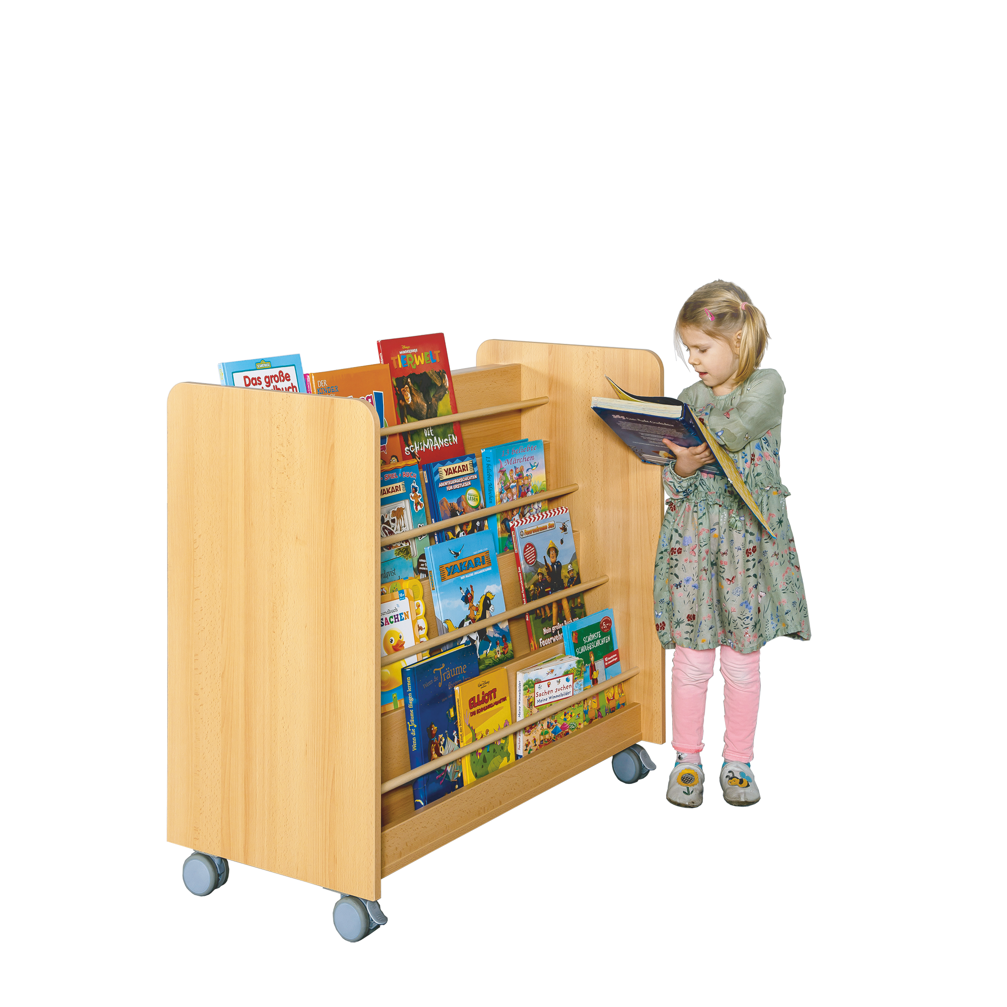Fahrbarer, doppelseitig nutzbarer Bücherwagen mit Schrägablagen und Bügelgriffe. Je eine Schrägablage auf jeder Seite. 4 Kunststoffrollen, davon 2 feststellbar. Der Bücherwagen kann in verschiedenen Dekoren geliefert werden.