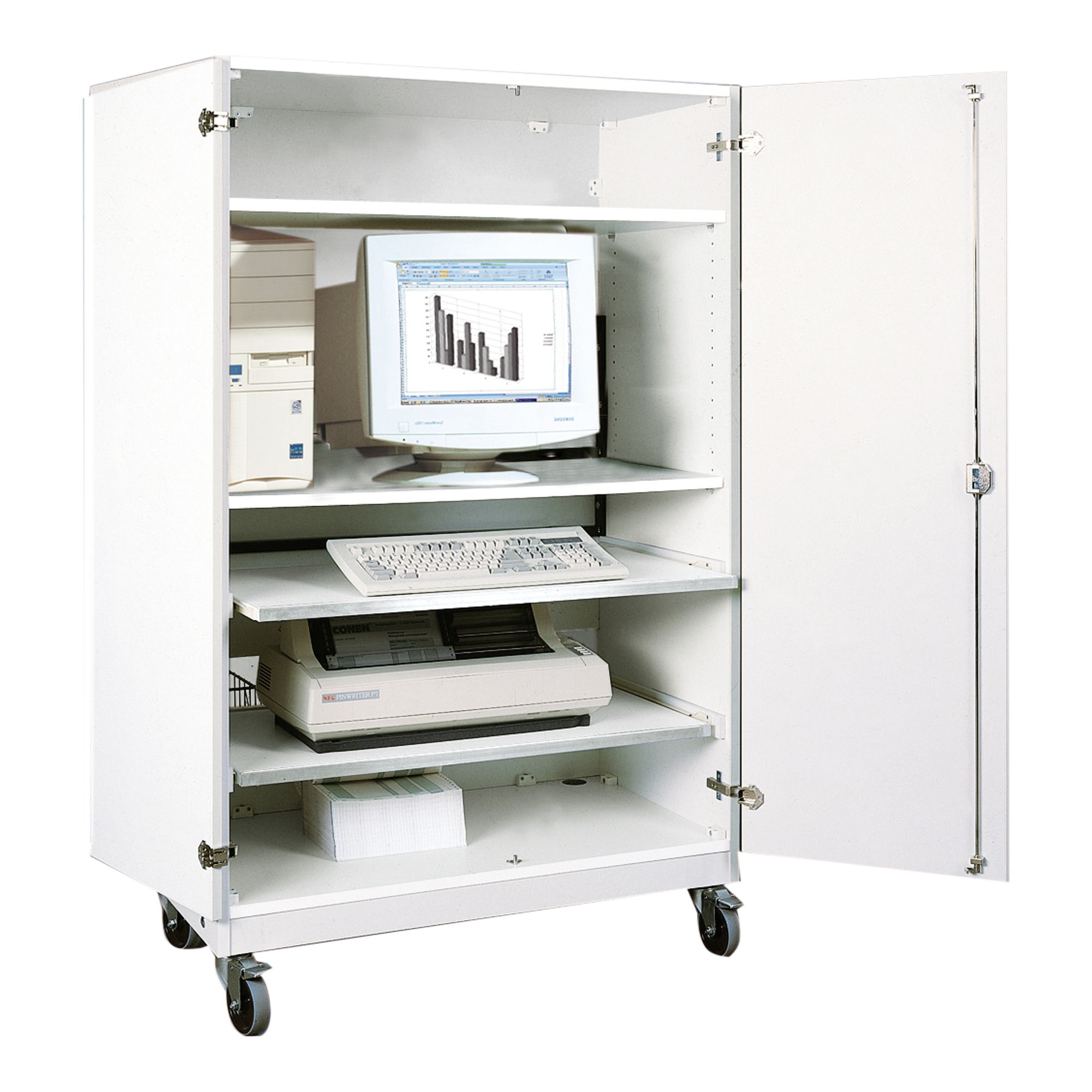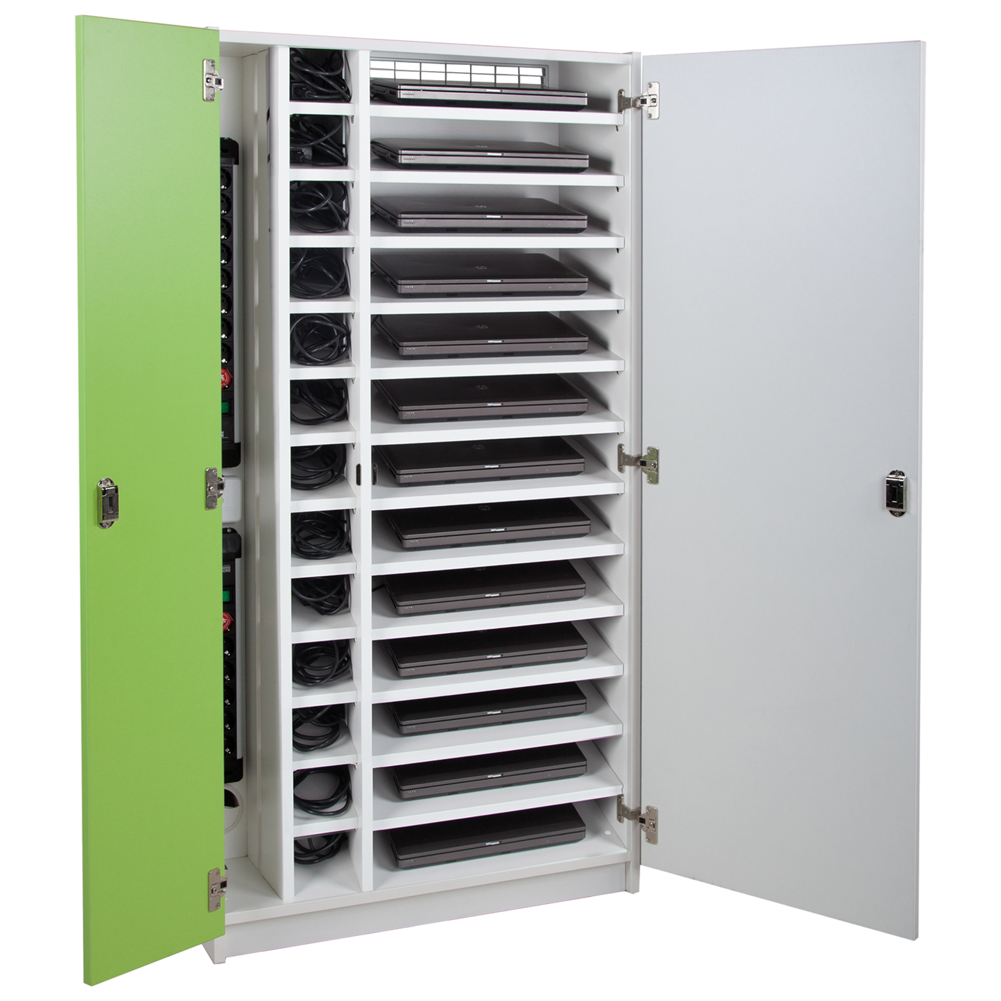 Unsere Computerschränke mit abschließbaren Türen sind die perfekte Lösung für jeden ordentlichen IT- Bereich. Die Fächer bieten genug Platz für Notebooks und dergleichen während die Mehrfachsteckdosenleiste ein gleichzeitiges Laden multipler Geräte ermöglicht. Durch die Lüftungsschlitze können die Rechner auch im Schrank in Betrieb bleiben, ohne zu überhitzen.