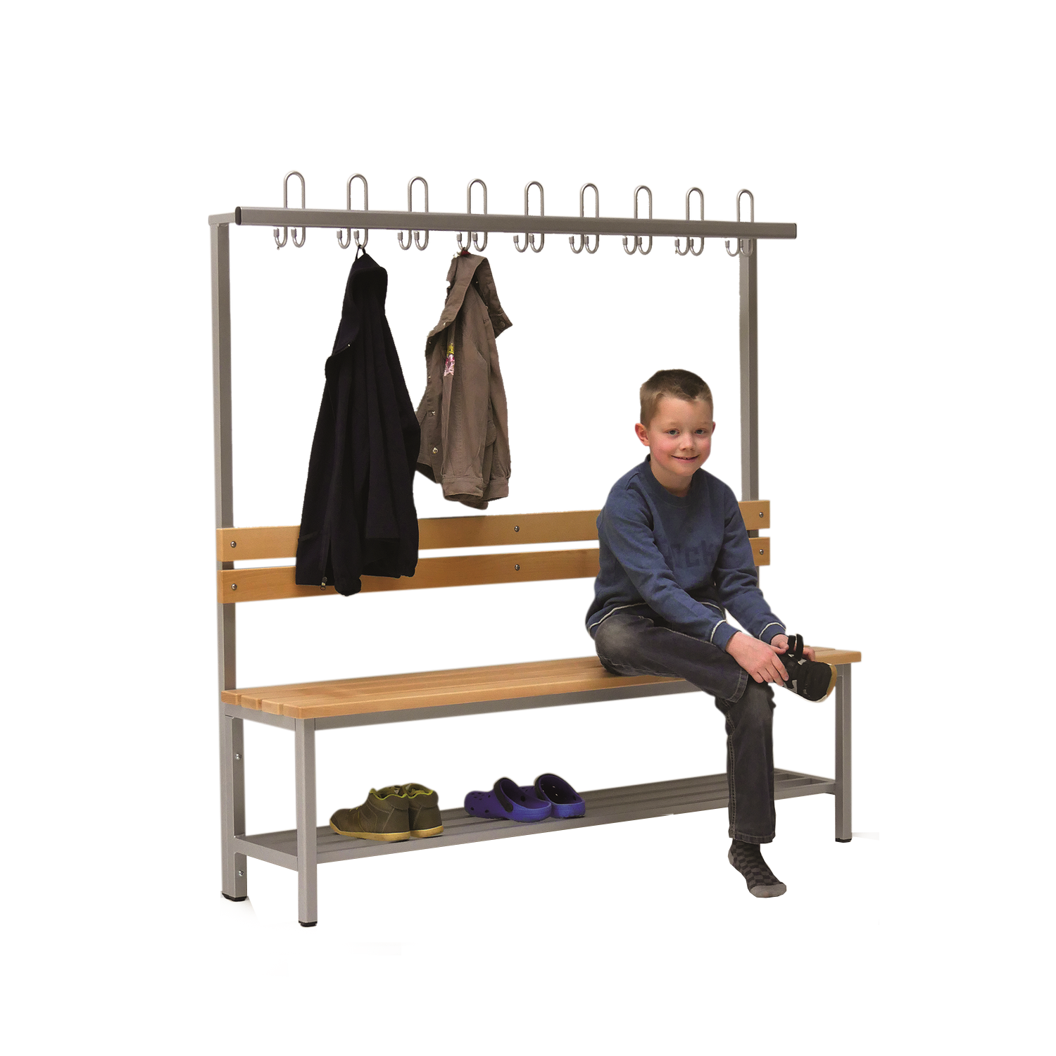 Die Garderobenbänke mit Kleiderhaken stellen ihre eigene kleine Einheit dar, die in keinem Umkleideraum fehlen darf. Einfaches funktionelles Design sorgt dafür, dass sie überall Anwendung finden und die Conen Qualität sorgt dafür, dass sie auch den energetischsten Rabauken standhält.
