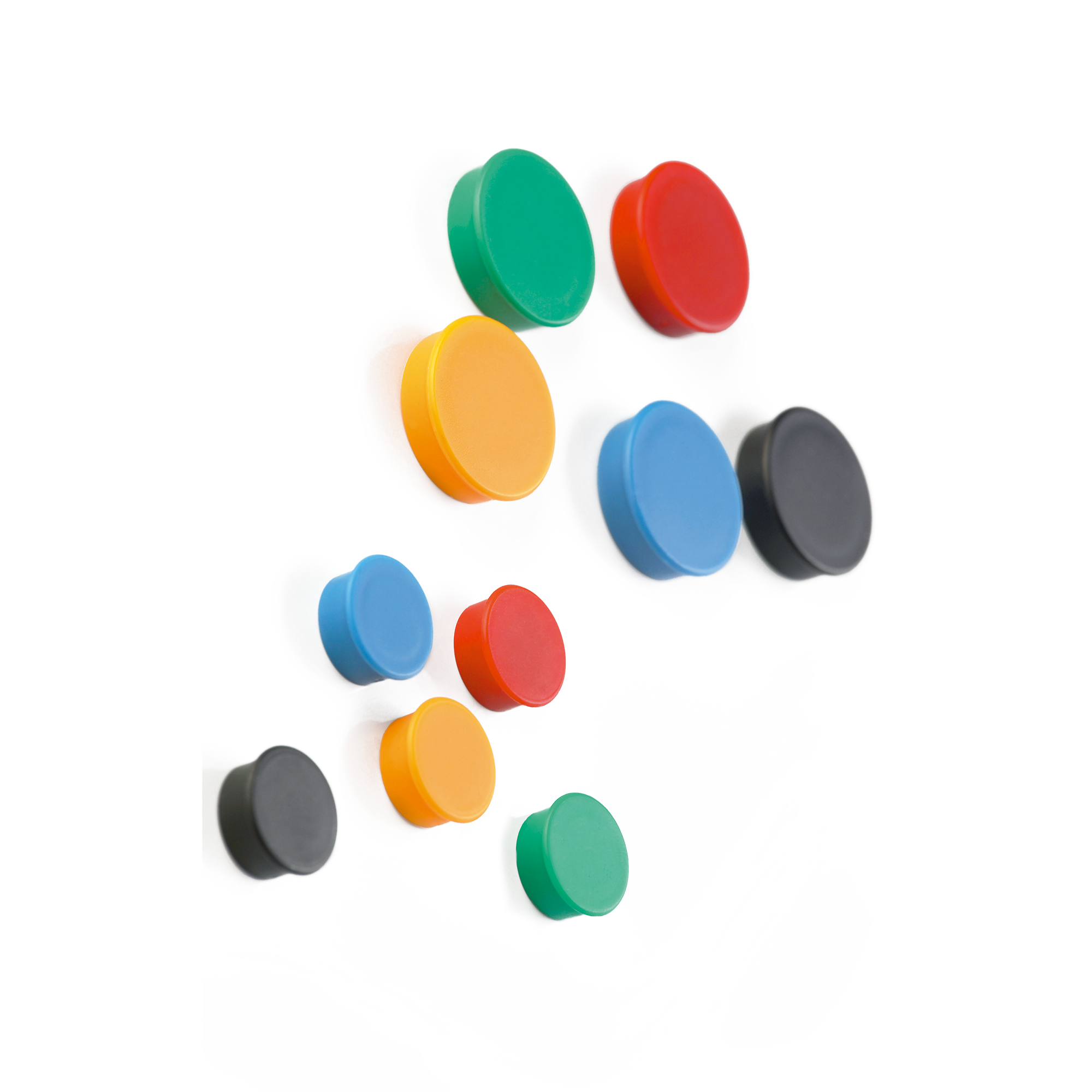 Dieses Set beinhaltet 12 Kraftmagnete, sortiert, je 2 Stück blau, rot, schwarz, grün, gelb und weiß.